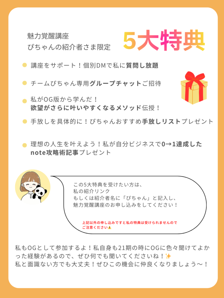 私の紹介で入っていただいた方には5大特典もプレゼントしますので、ぜひ私の紹介リンクもしくは、紹介者欄に「ぴちゃん」とご記入ください!